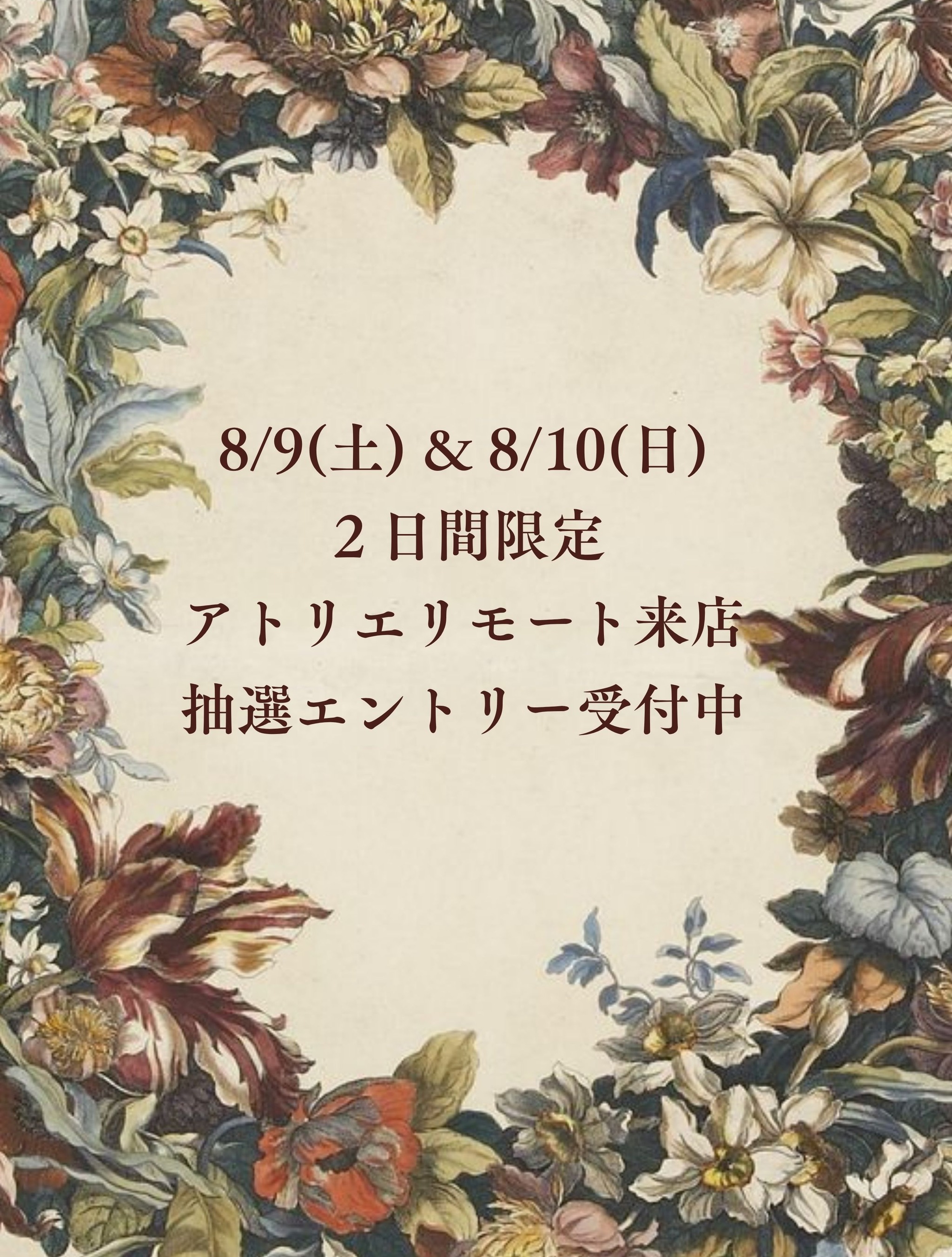 📝 抽選お申込み期間  ̄ ̄ ̄ ̄ ̄ ̄ ̄ ̄ ̄ ̄ 8/2(土)〜8/4(月) 10:00まで 📮 抽選結果の発表  ̄ ̄ ̄ ̄ ̄ ̄ ̄ ̄ ̄ ̄ ご応募くださった皆様へ 8/4(月) 中に 抽選結果をご連絡いたします✉️ 🌟リモートご来店ご希望の方は、 こちらのフォームからご応募ください🔽 🔗https://docs.google.com/forms/d/e/1FAIpQLScLTpYO8RkZUmmOXRw2gj60oiQiKXJiLmhy0vrjHfVUXXrMfQ/viewform?usp=sharing&ouid=102488390963785412392 皆さまとお話できることを楽しみにしています🪞どうぞお気軽にご応募くださいね🕊️ -—————————-————————— Next POPUP 📍リモートアトリエ 💻🌿 ※完全ご予約制※ ■8月9日(土)〜8月10日(日) ■営業時間:11:00〜17:00 📍代官山maruoアトリエ ご予約不要フリーオープン✨ ■営業時間:11:00〜18:00 (※13:00-14:00は一旦クローズ) -—————————-—————————