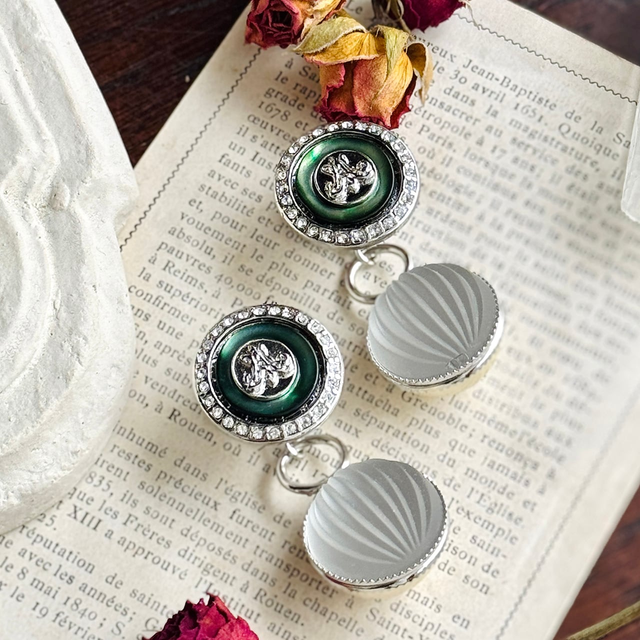 シェルボタンの周りを縁取るようにキラキラと輝くガラスパーツは