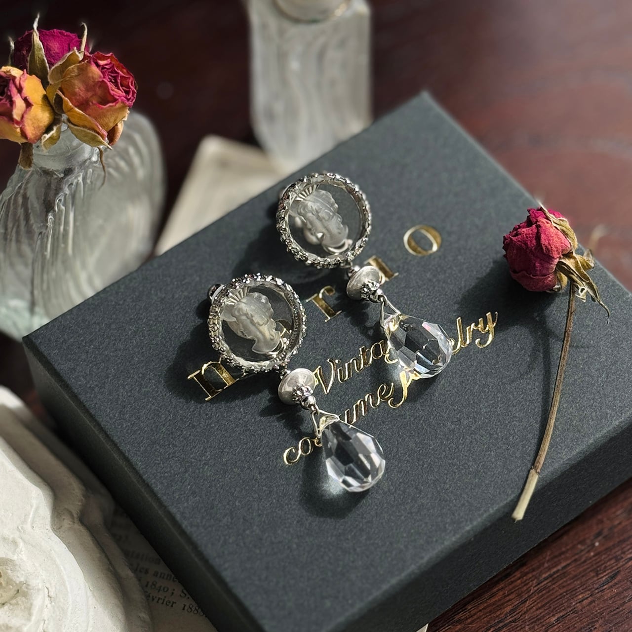 貴婦人の彫られた淡いグレーのインタリオガラス。