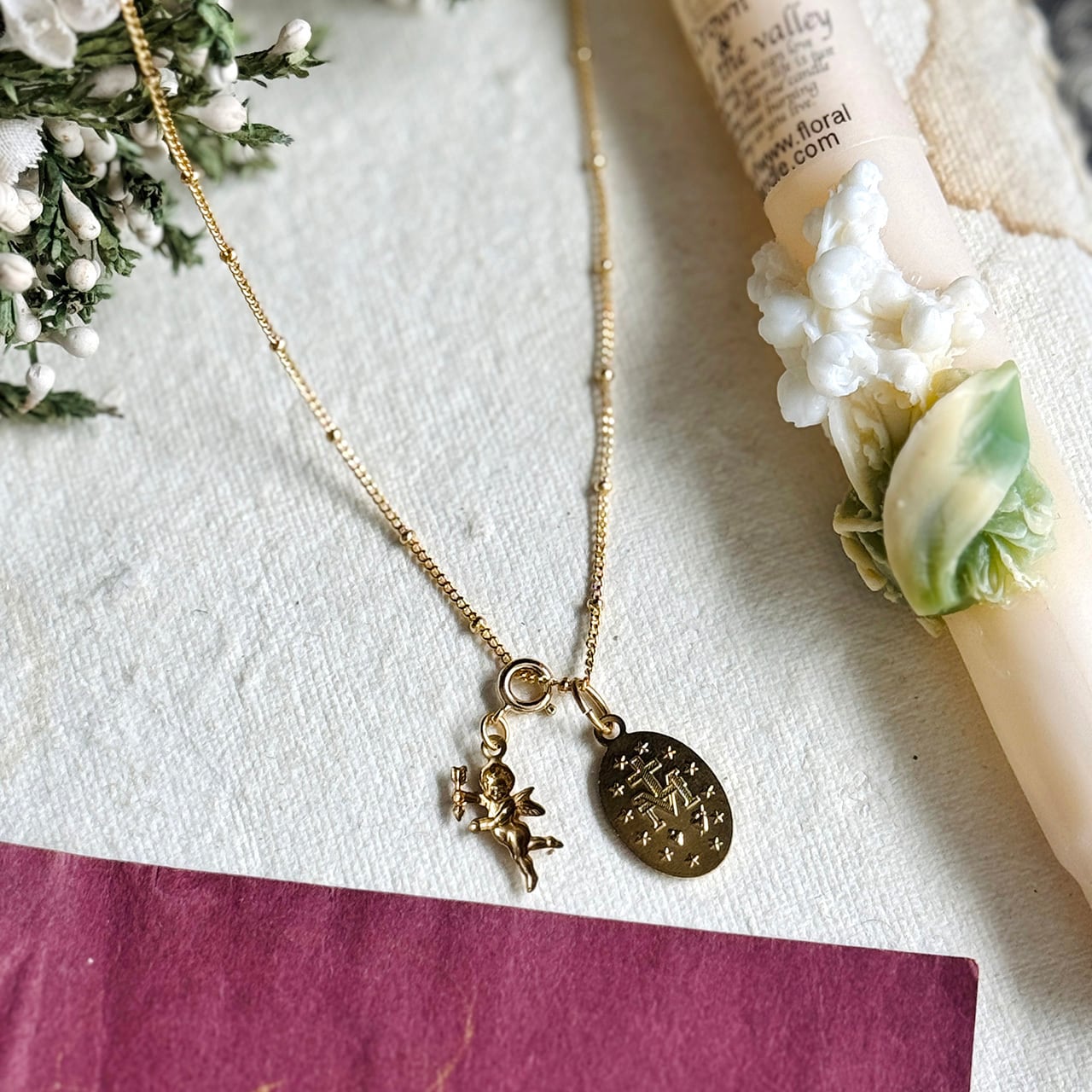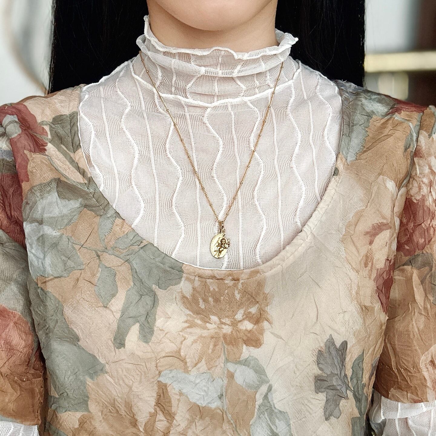 小さな天使のモチーフが胸元を舞うのが愛らしいです。