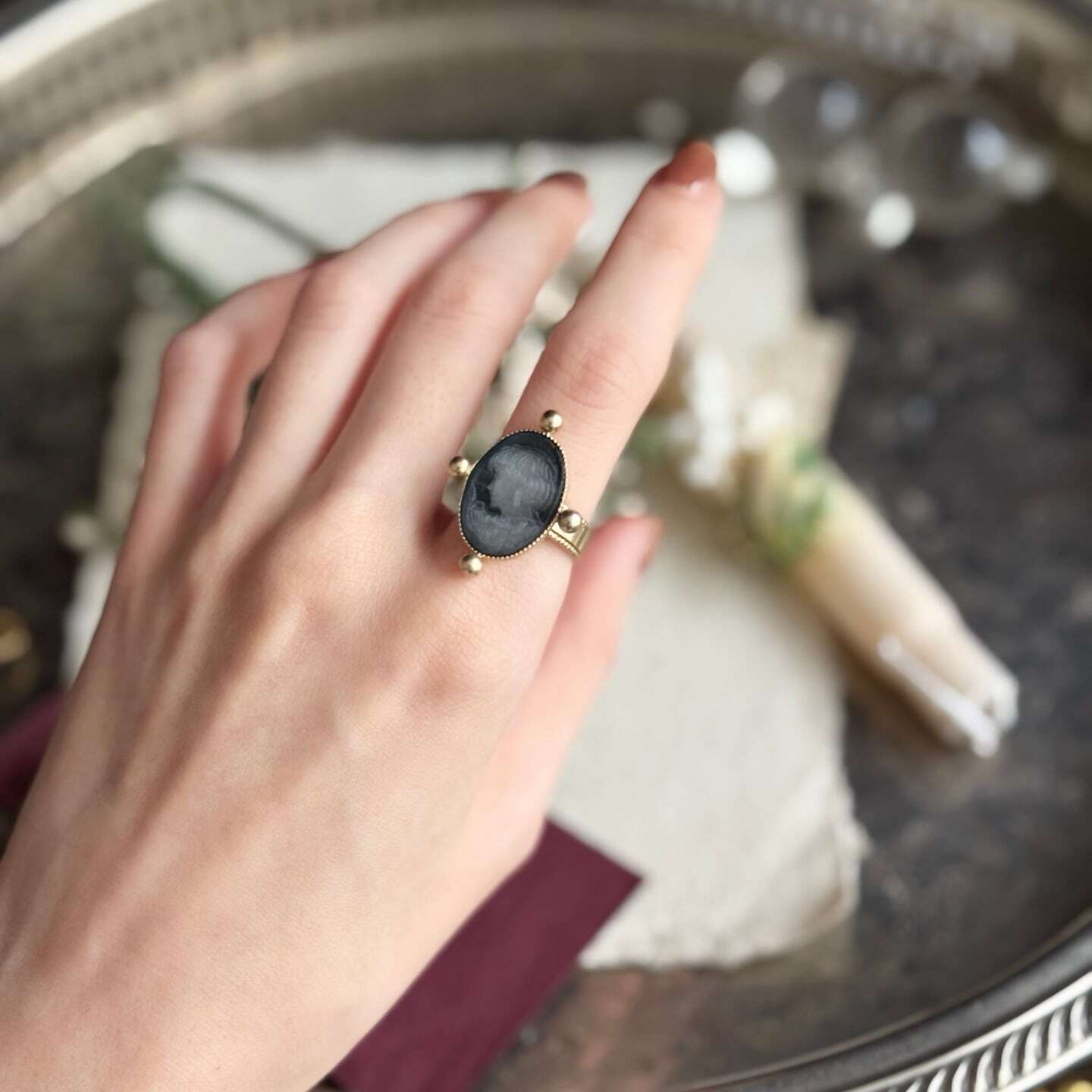 フランス語で「水鏡のカメオ」を表すリング。