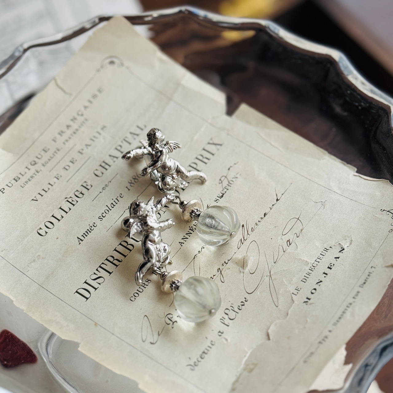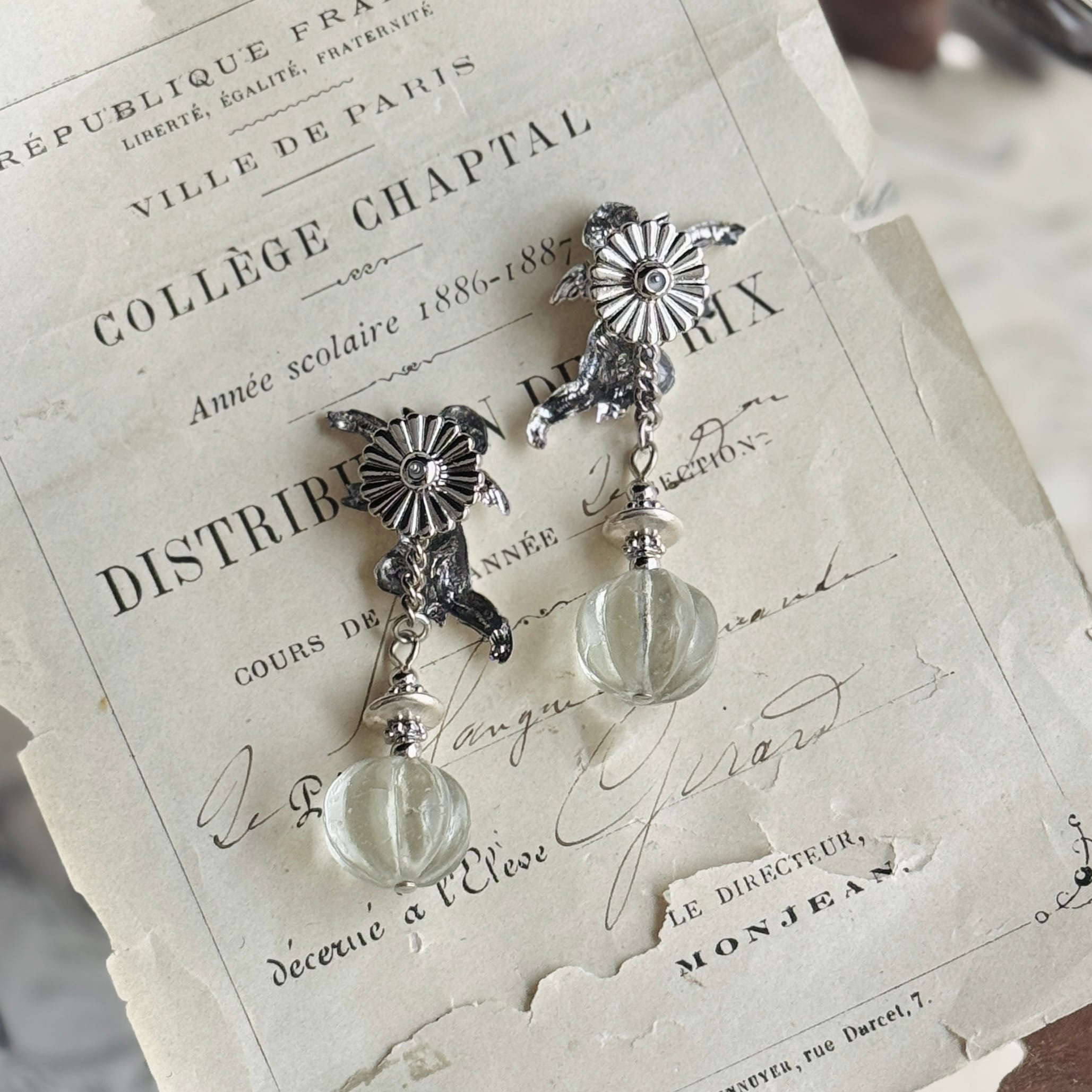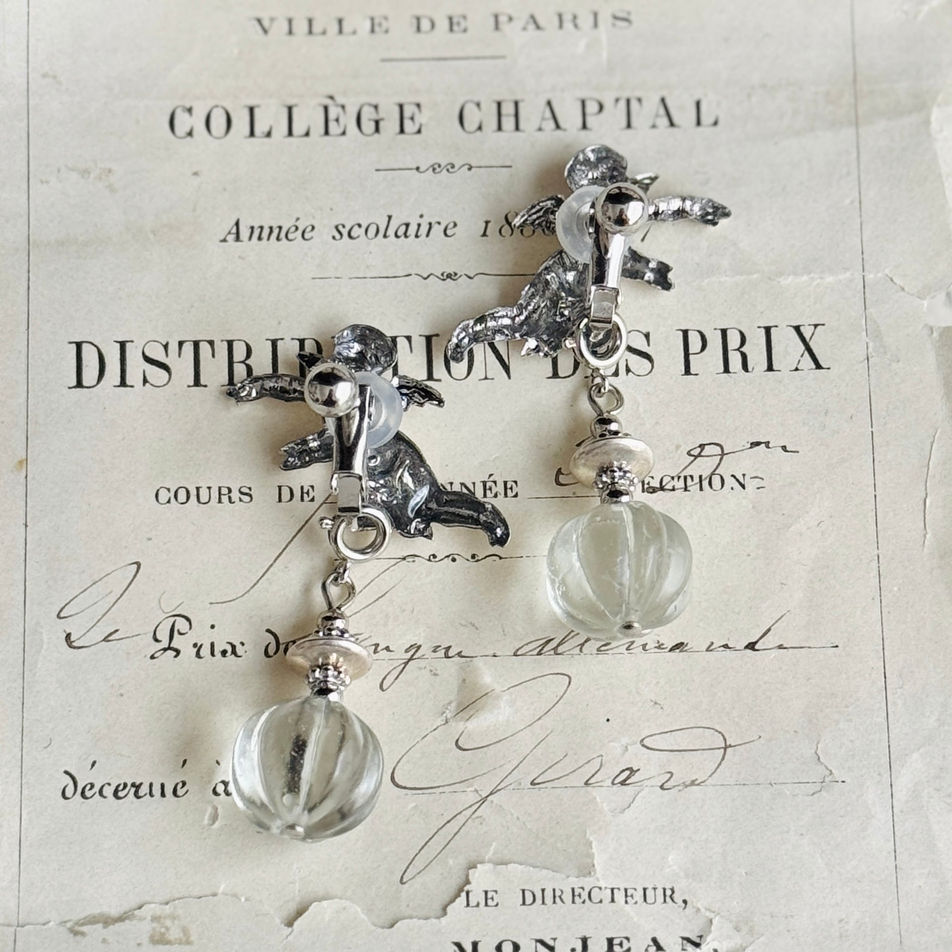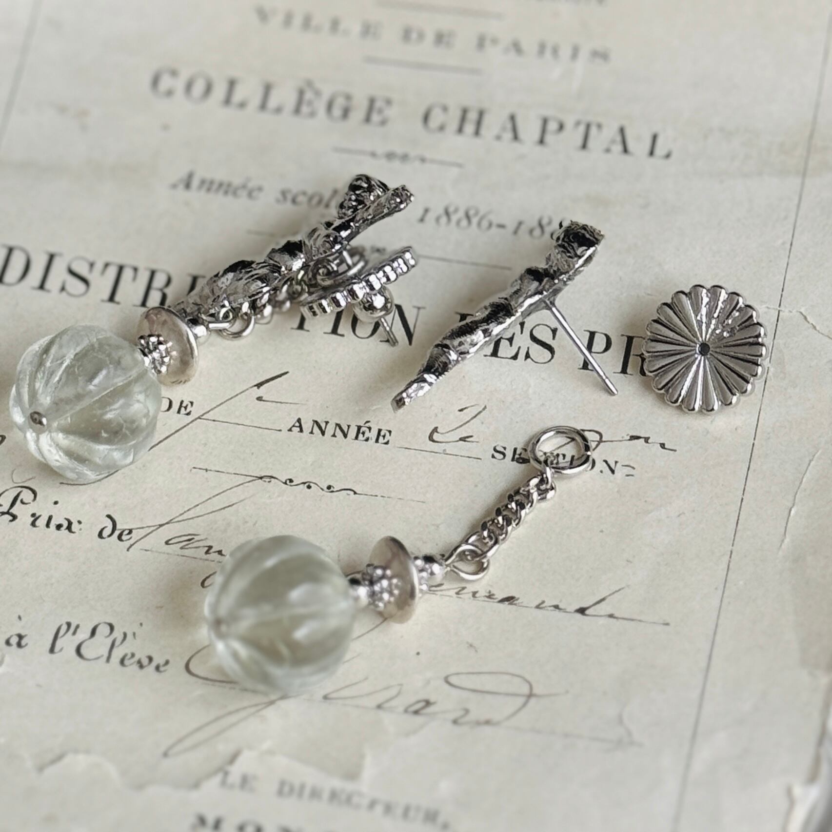 ヴィンテージの小さなガラスが耳元で揺れるデザイン。