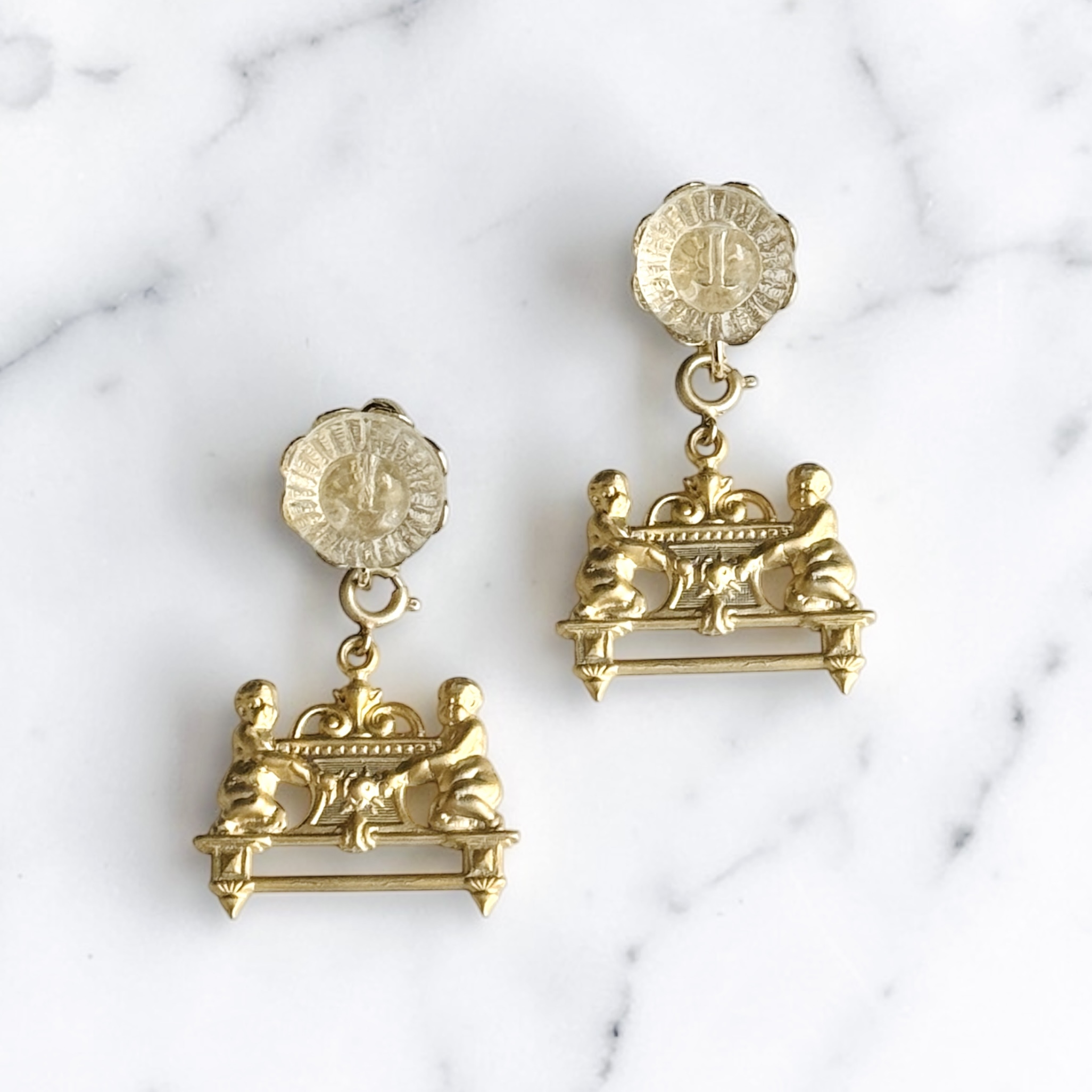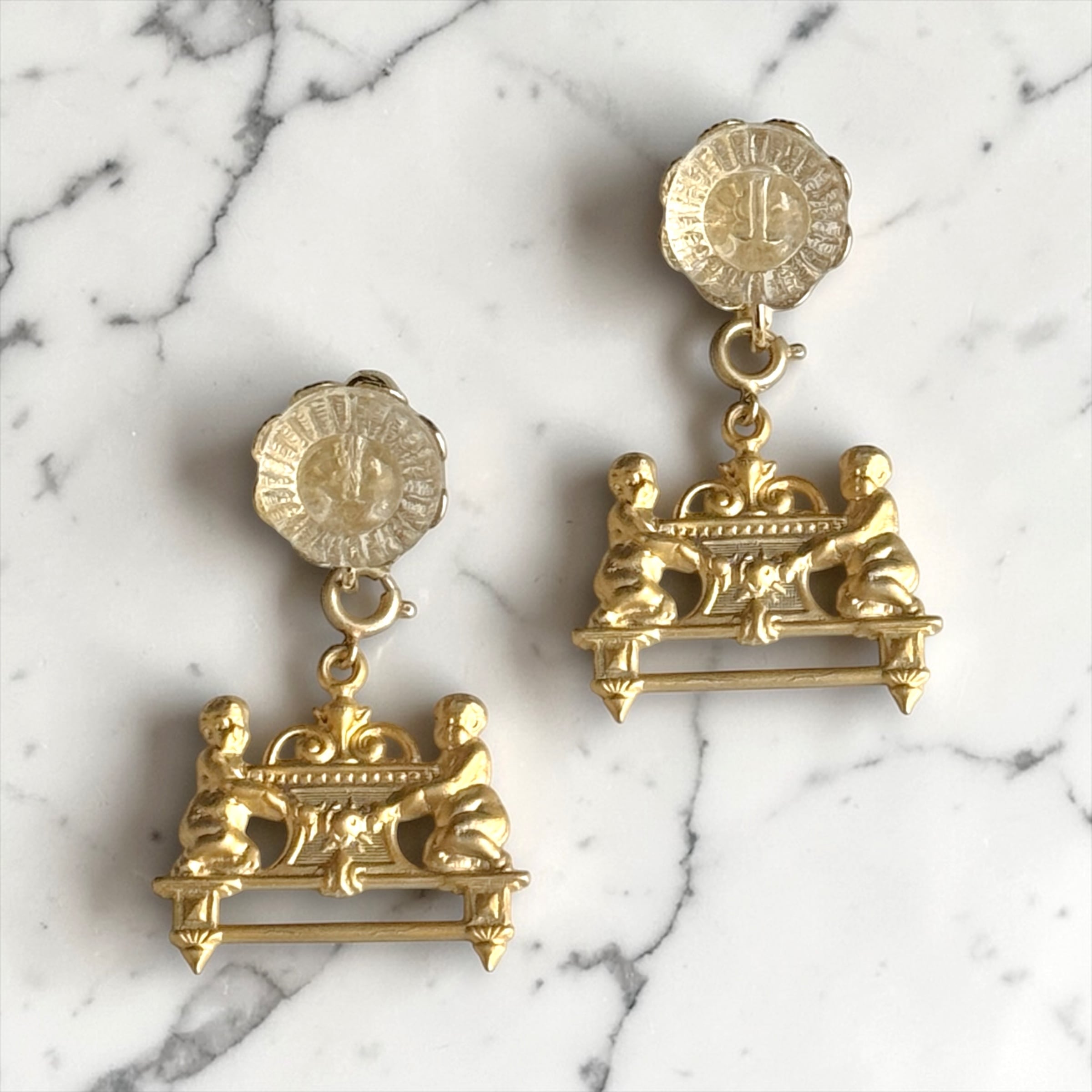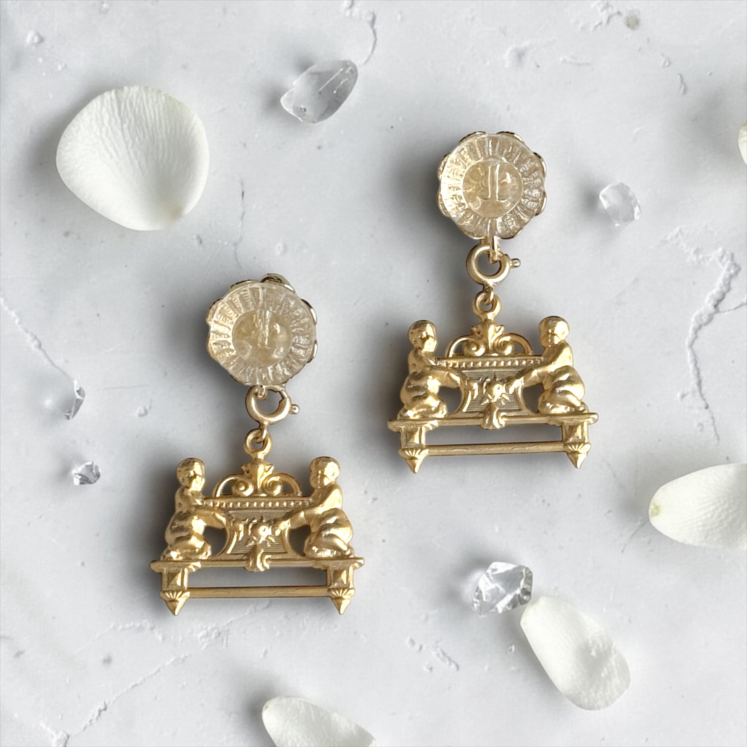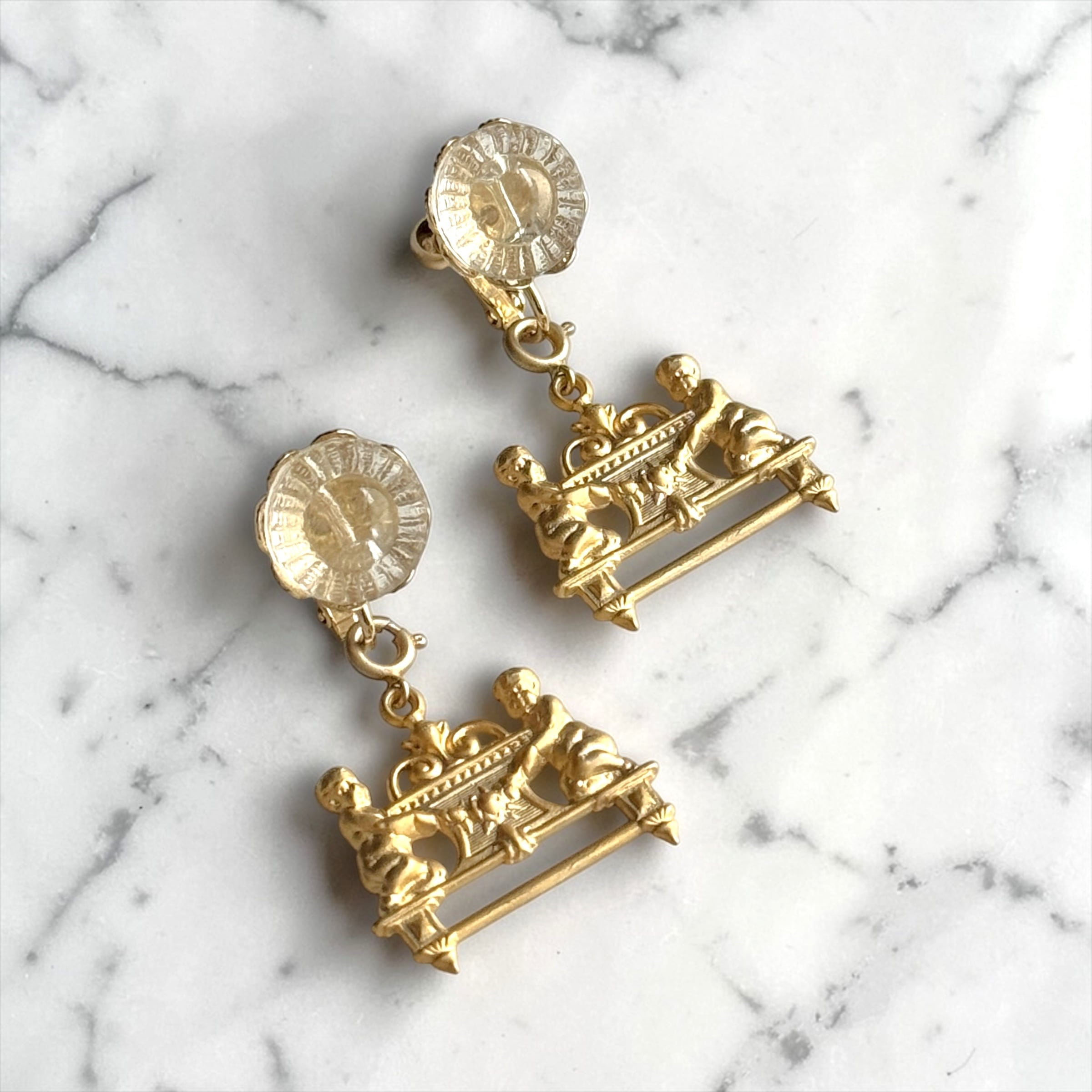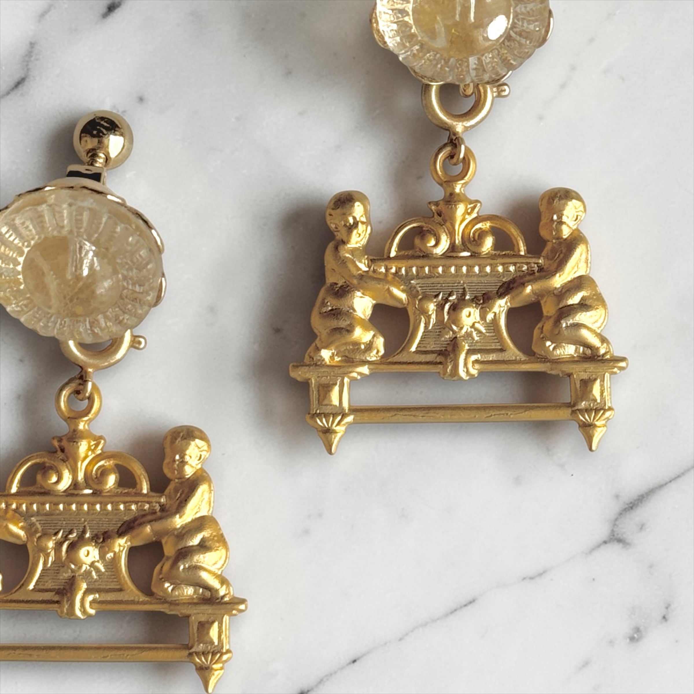 二人の天使が楽しげに集い、その上には透き通るヴィンテージガラスのボタンが、