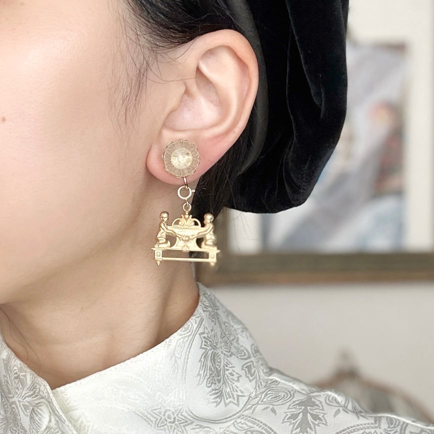 イヤリングはボトムを着脱できる仕組みで、トップのみでも小ぶりにお使いいただけます。また、お手持ちのイヤリングにボトムをつけて、アレンジしてお使いいただくこともできます。