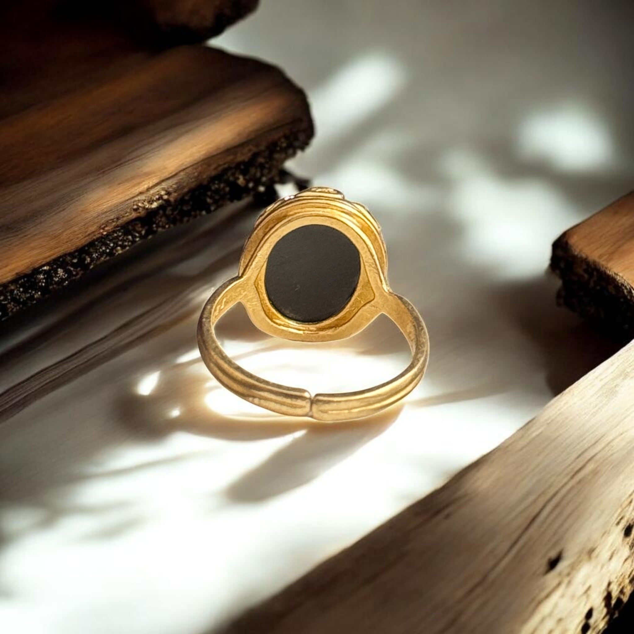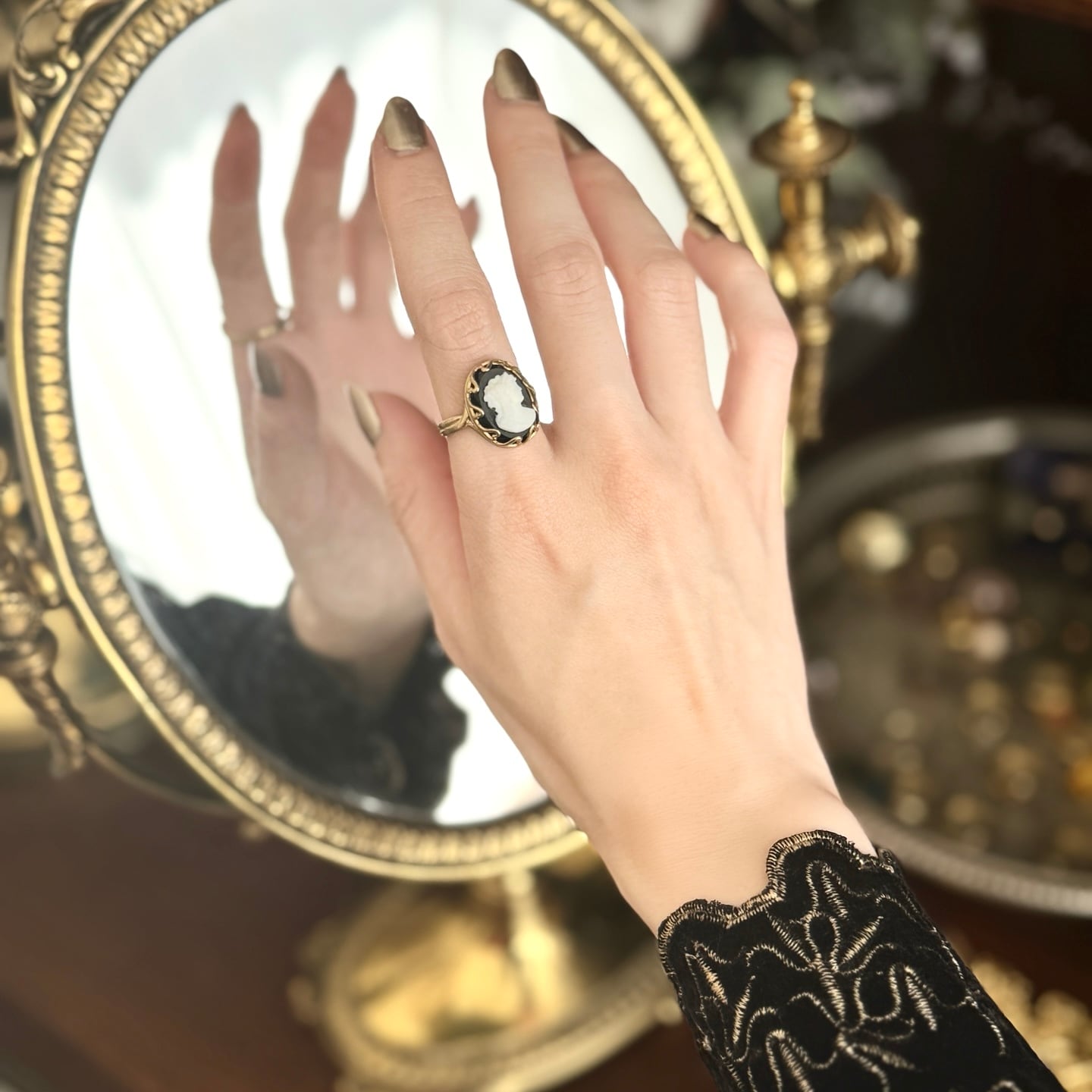 シックなモノトーンのカメオを縁取るのは、透かし彫りのように緻密なデザイン。