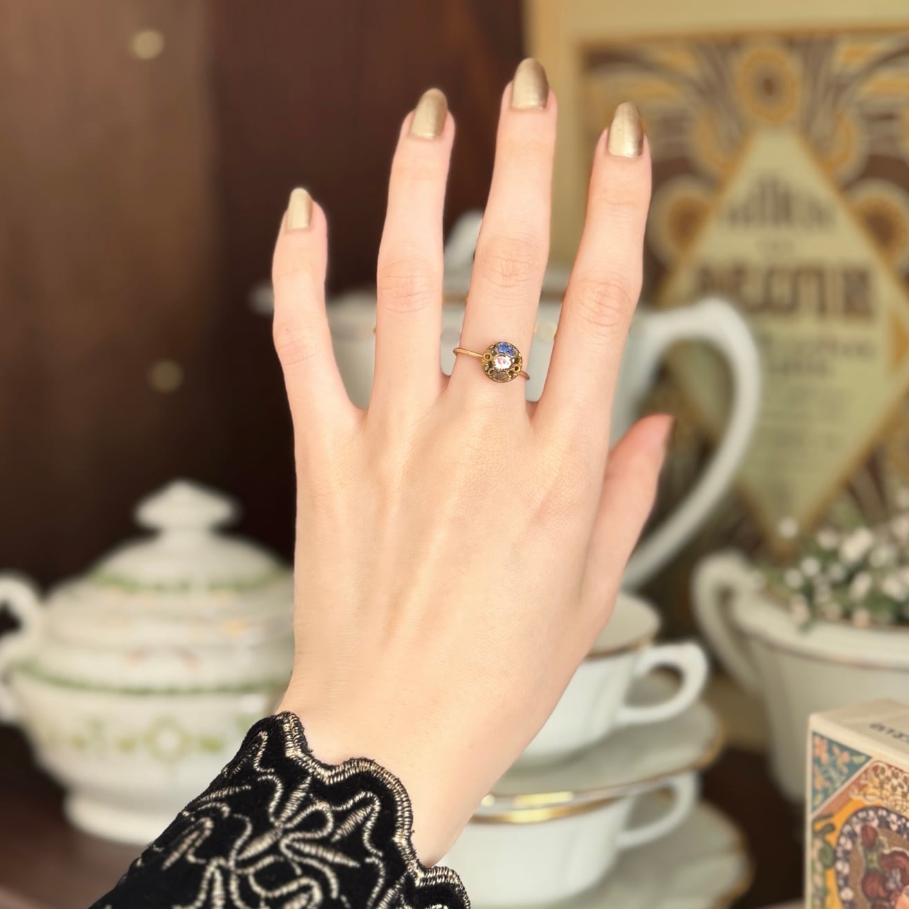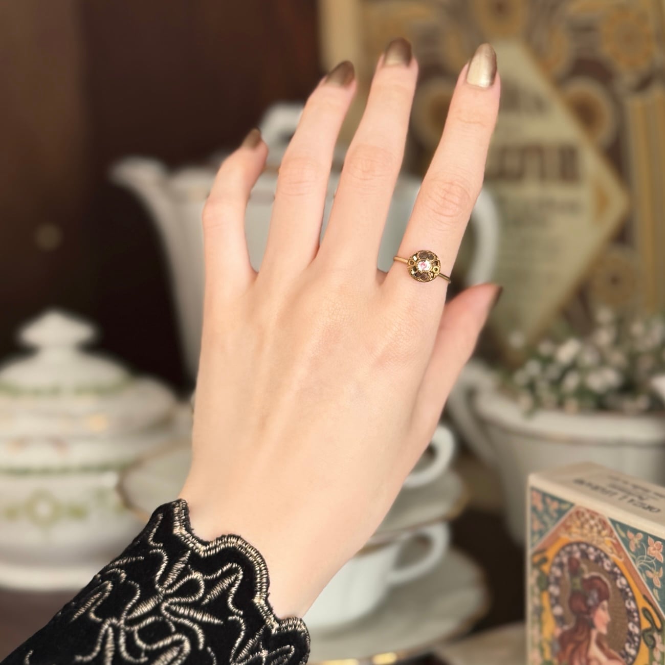 台座に使用したのも、フランスで出会った繊細なヴィンテージパーツ。