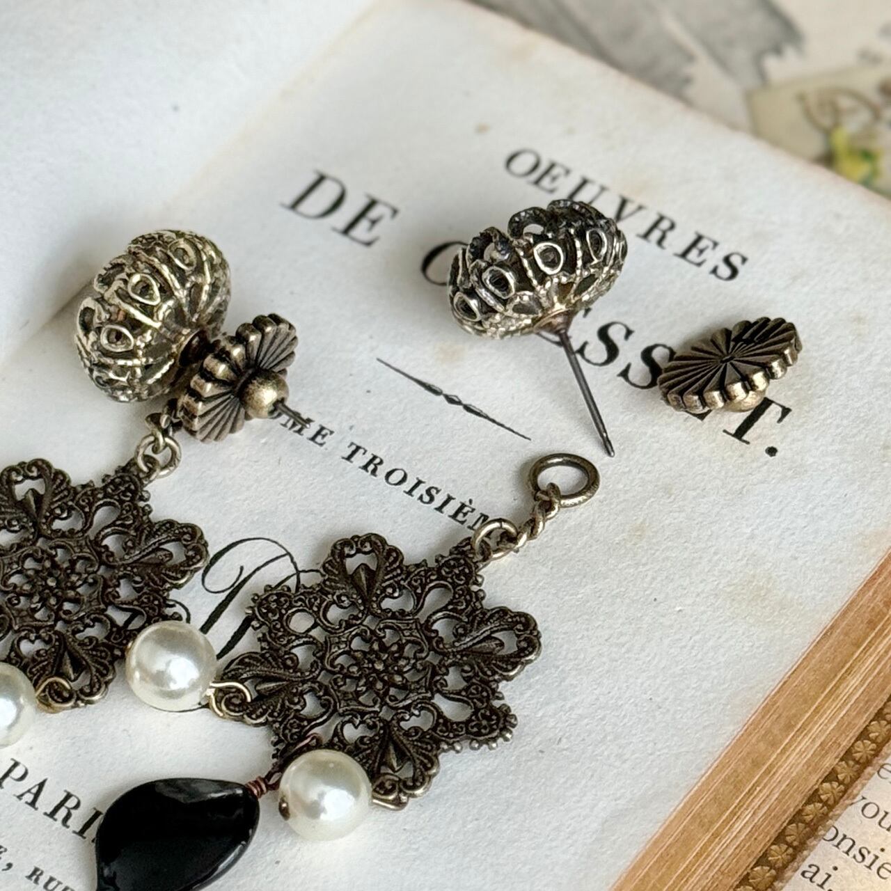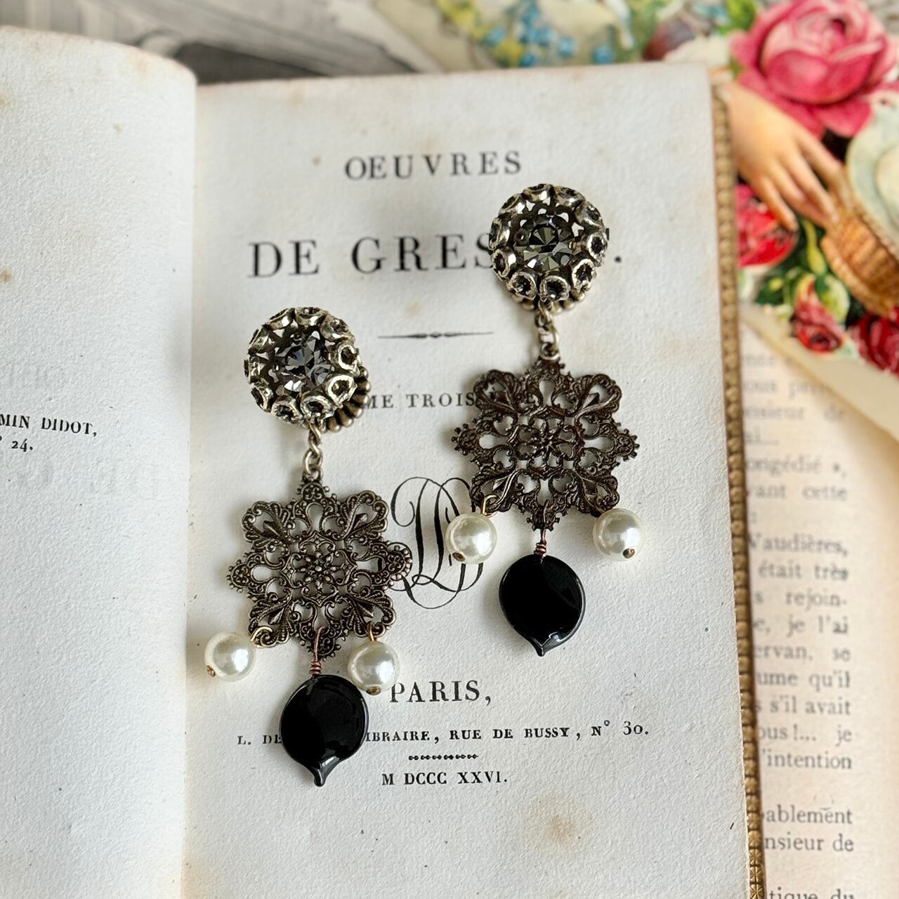 小さなヴィンテージパールと、花びらのようなアンティークガラスを1枚はらりと添えてシックなジュエリーに仕立てました。