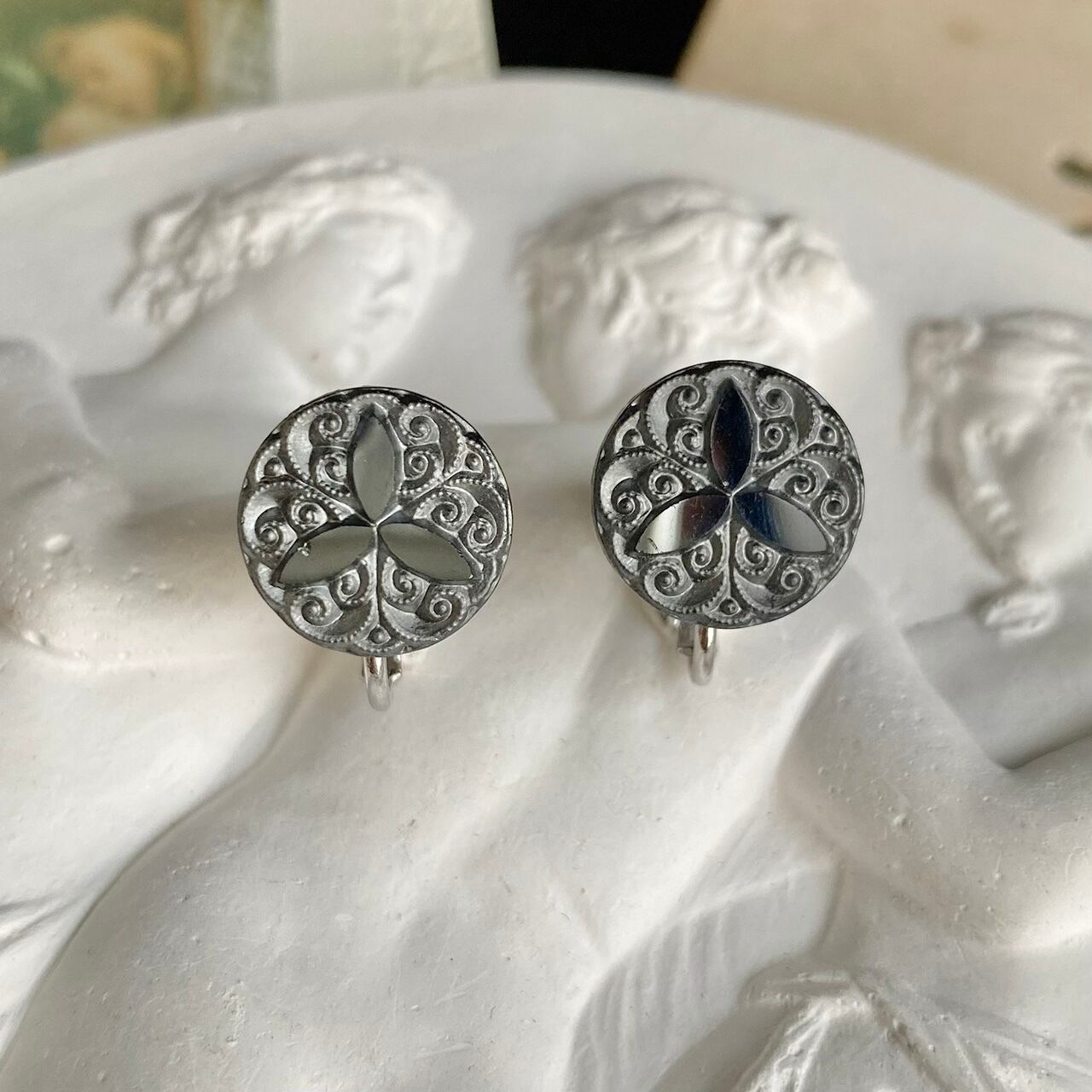 フランスのトップメゾンのアトリエから出てきたガラスボタンと、100年以上前のantiqueパーツを組み合わせたエレガントでクールな印象のジュエリー。