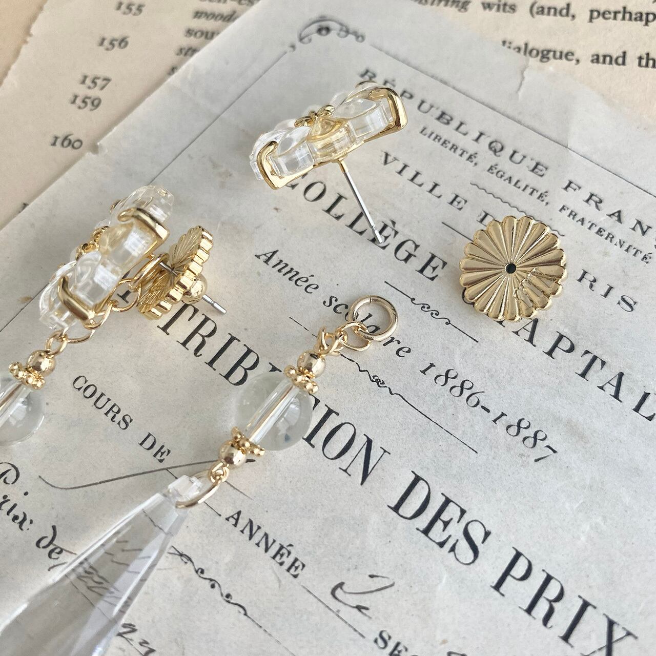 ヨーロッパのシャンデリアとして使われる予定だった、ヴィンテージのシャンデリアクリスタルをアップサイクルしたイヤリング・ピアスシリーズです。トップ部分に使用しているフラワーモチーフのシャンデリアクリスタルは、シャンデリアでは脇役として使用されるパーツ。ジュエリーにリデザインするにあたり、日陰の存在だったフラワーモチーフが主役になるようなデザインにいたしました。デッドストックと言って、一度も表に出なかったものを使用しているため、ヴィンテージですが状態が良いのも特徴です。