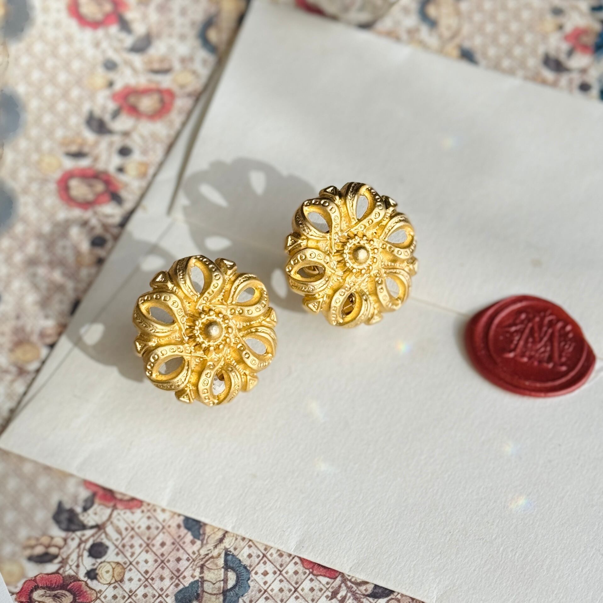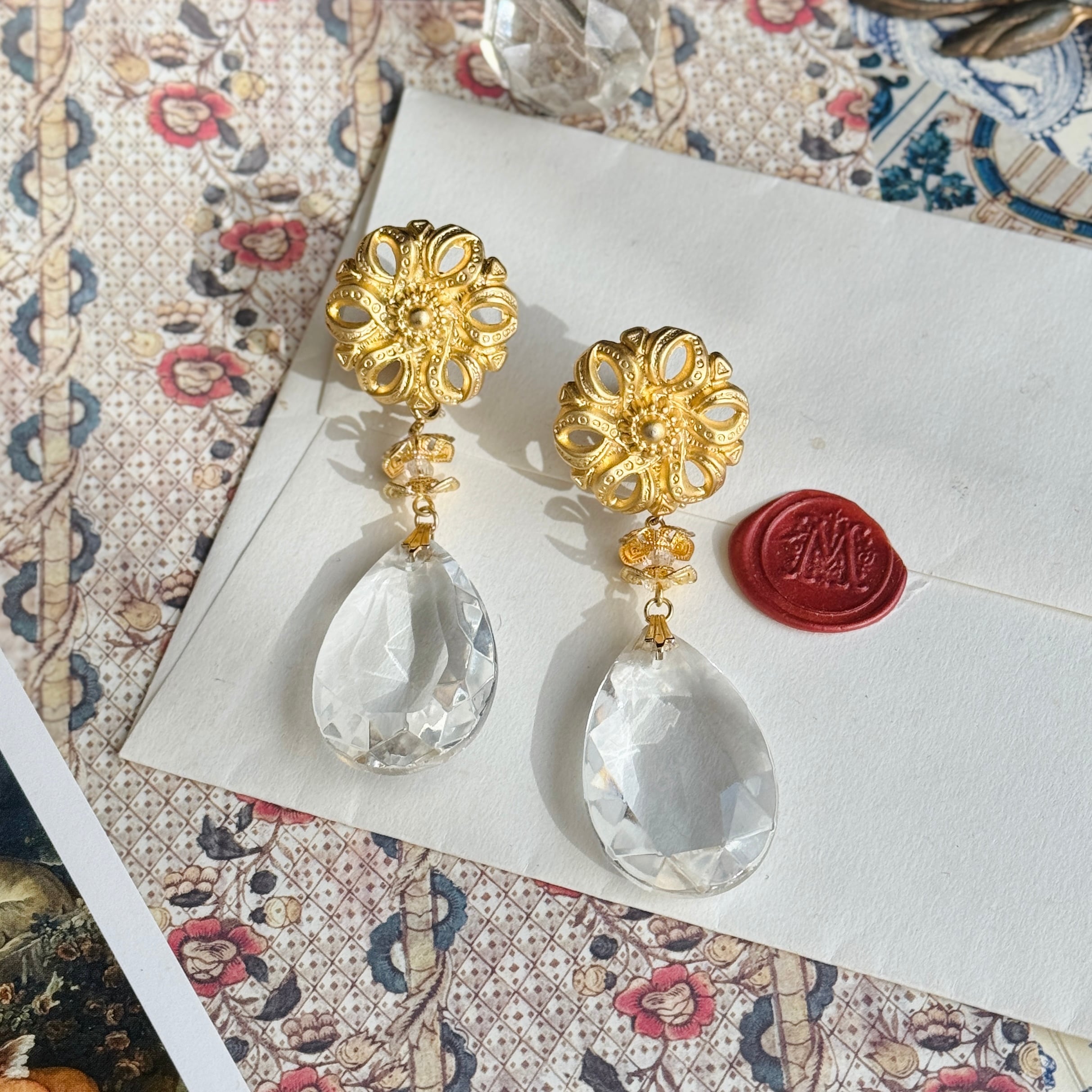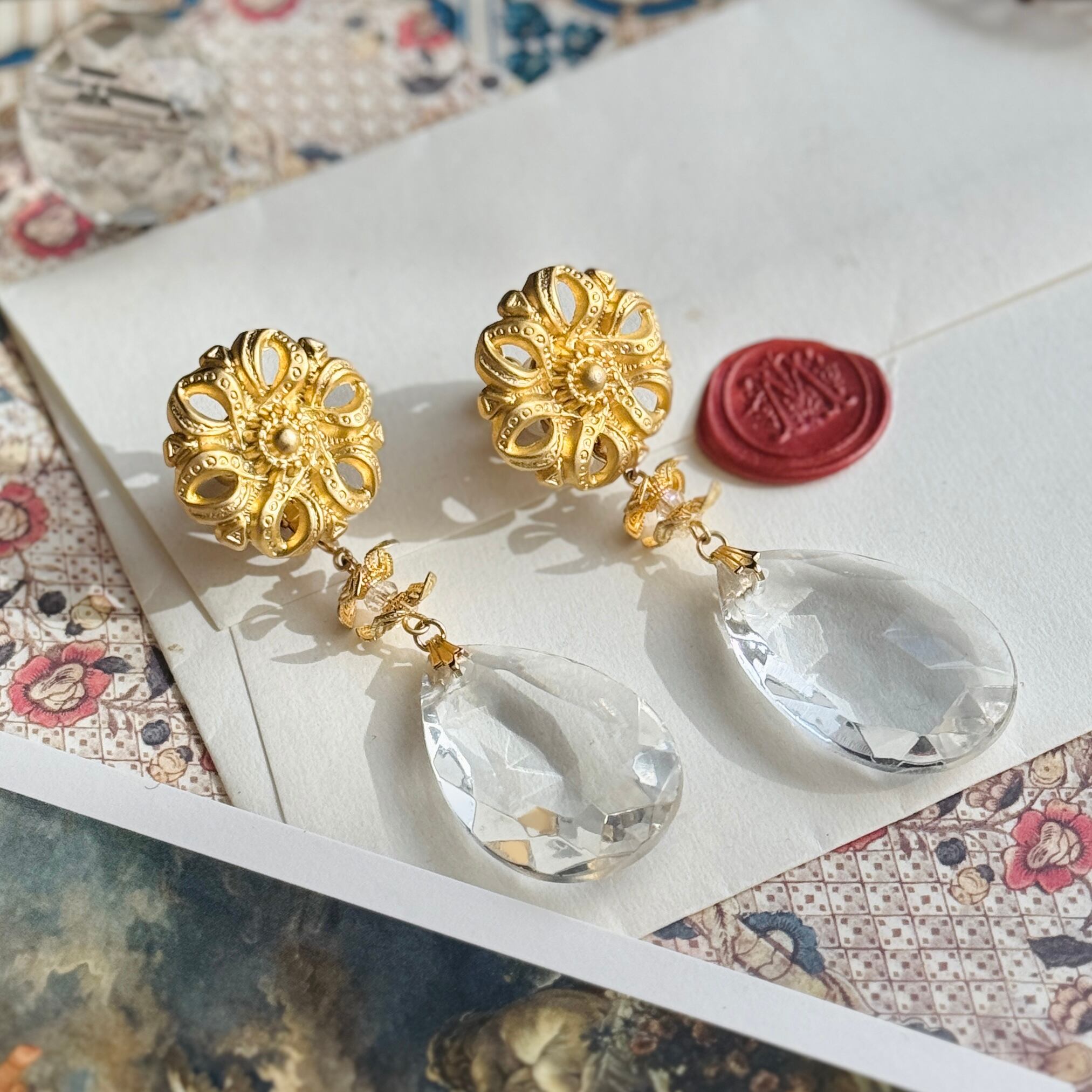 The vintage French button at the top features a matte gold finish and a stunningly intricate texture that creates a sense of depth and elegance. Even when worn on its own, the top part alone provides a sophisticated look.