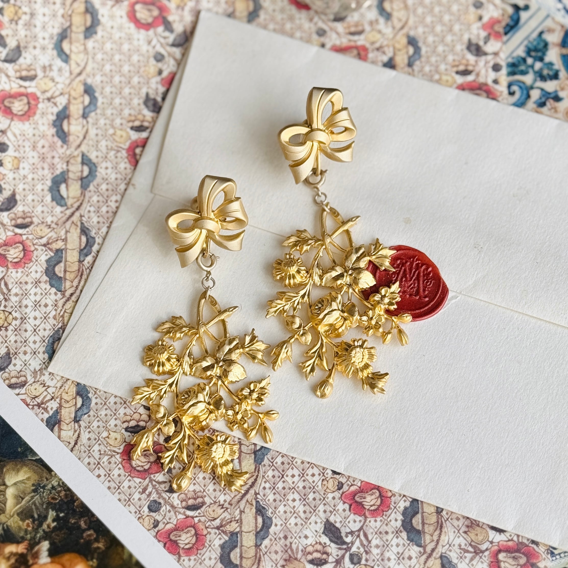 Both the top and bottom parts of these earrings feature antique motifs crafted in France over 100 years ago. The exquisite design, which beautifully combines roses, daisies, and violets into a bouquet, makes this piece an ideal gift for someone special.